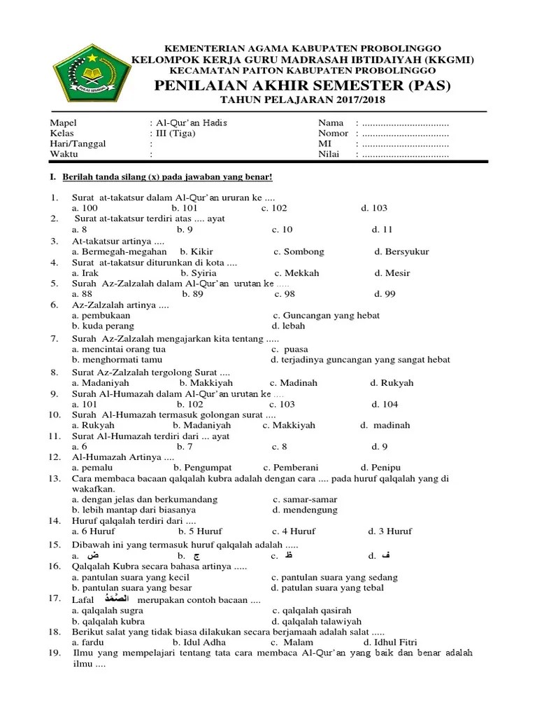 Berilah tanda silang (x) di depan huruf a,b,c atau d pada jawaban yang tepat ! Contoh soal dan kunci jawaban mapel ski kelas 3 mi semester genap kurikulum 2013 terbaru. Kumpulan soal pas al quran hadis madrasah ibtidaiyah kelas 1, 2, 3, 4,. Lembar soal mata pelajaran : Soal ujian akhir mi qur.